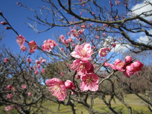 長居公園植物園の梅が咲き始めました バラ園から池の周りを歩きます、ここに菜の花が少し観れました その先には梅の花が咲いてました さらに進むと池の淵にアイスチューリップの花壇が有ります 良い感じに咲いています、インスタ映えスポットも~ ( ゚Д゚)おっ…