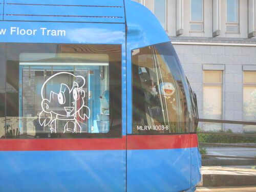 ドラえもんトラムに遭遇しました、運手席にはドラえもん~♪ 富山高岡市出身の漫画家藤子・F・不二雄さんの代表作ドラえもんを路面電車にあしらってます 少し走って道の駅雨晴 到着~ ここからは富山湾の絶景が観れます 女岩、そして義経神社 丁度氷見線の列…