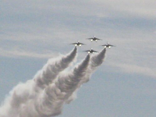 さぁ~いよいよブルーインパルスの登場です 被写体が速い!腕がついて行きません~コンデジですので~m(__)m 雰囲気が伝われば良いのですが ご覧ください~ 4機によるオープニング いや~スゴイ! ♡ ☆ 素晴らしい~!(^^)! 満足です おまけ・・・家に有った…