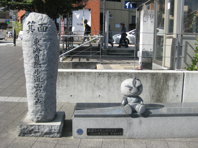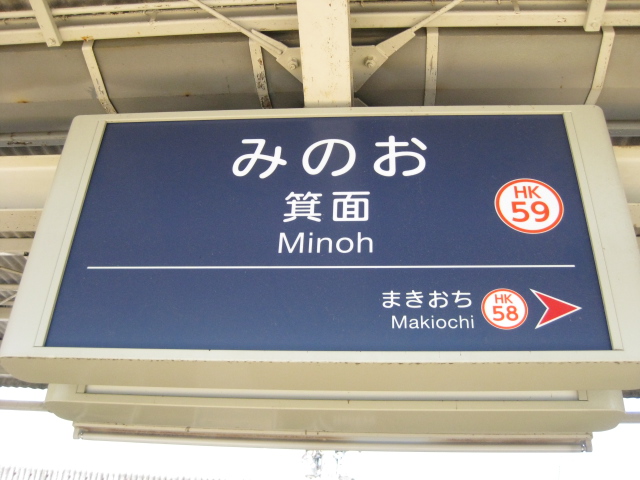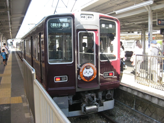 箕面線の電車がやって来ました、ちいかわのサボが付いてます