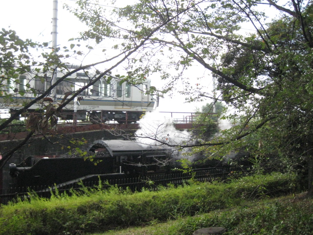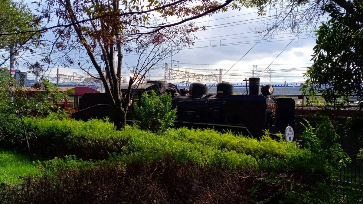 ここには京都鉄道館のSLが走る線路が伸びてます、丁度SL C56がやって来ました
