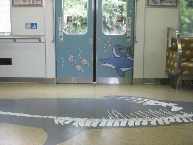 この電車は~何と7月13日にデビューしたばかりの「かなた」号です、テーマは「太古から未来へ」室内もテーマに沿った装飾になってます