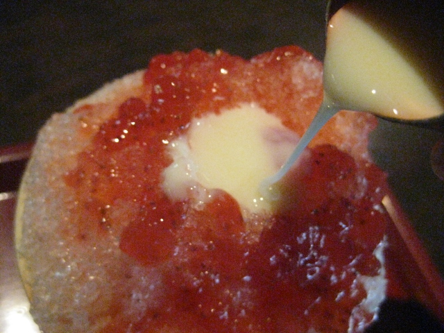 ( ゚Д゚)おっ~このビジュアル(^_^;)これは~予想してませんでした、いちごかき氷の天辺につぶら餅が乗っかってました
