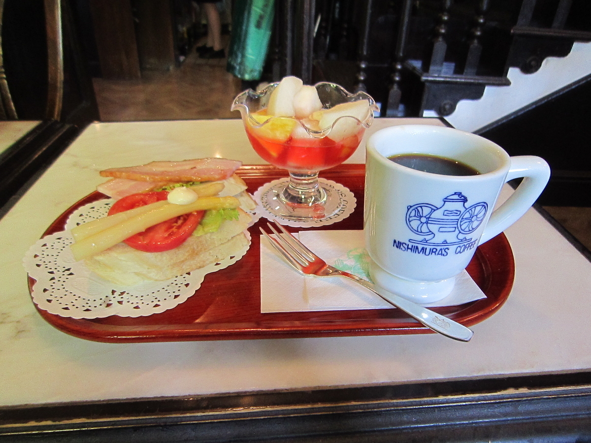 コーヒーはオリジナルカップです、にしむら珈琲店のコーヒーは宮水コーヒーと言い、灘のお酒に使われる厳選された宮水を利用しています、少し酸味があるコーヒーです