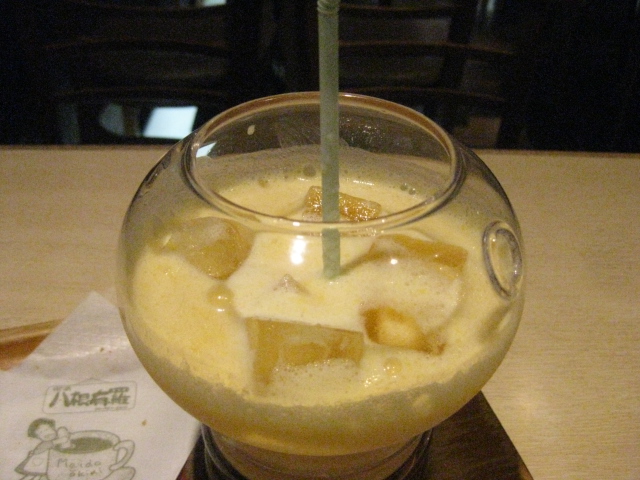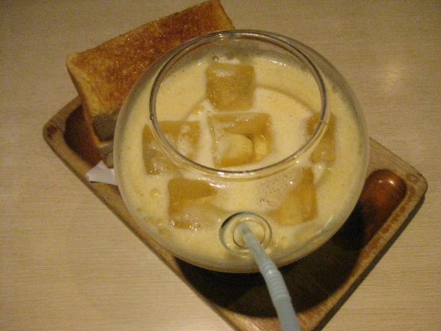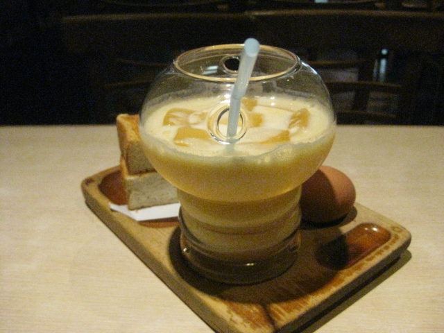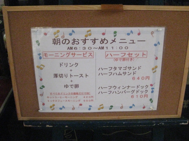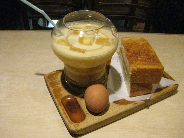 お邪魔します~奥の席へ、こちらのモーニングはドリンク代でトースト&ゆでたまごが付きます、おススメはミックスジュースです、ではお願いします
