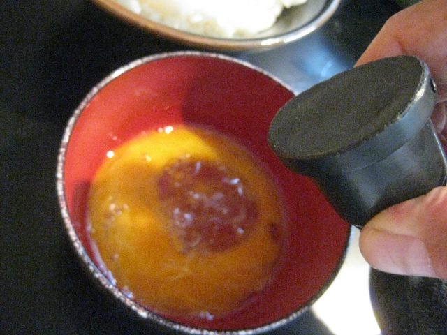 タマゴを追加します、お椀でかき混ぜて醤油を投入します